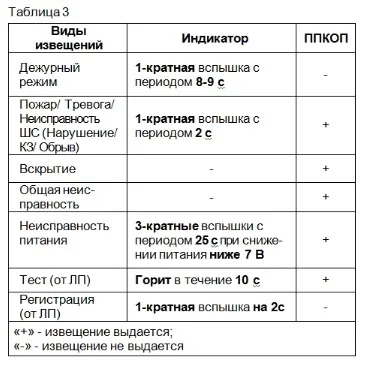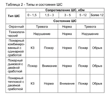 - сопротивление ШС для разных типов и состояний см. таблицу ниже
