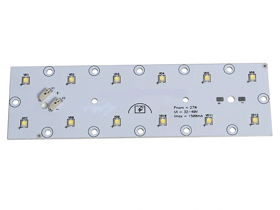 светодиодов (1*12). Для крепления платы предусмотрены отверстия диаметром 3,3 мм с изолированной зоной вокруг них диаметром 7 мм под головку винта М3 или заклепки. Для подключения питания предусмотрены контактные площадки, либо нажимные разъемы (Wago 2059-301 или аналоги).
