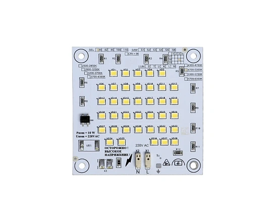 NEO-Q-38S2835-AC-90x90mm – плата из фольгированного алюминия, на которой могут быть смонтированы 6V светодиоды типоразмера — 2835. Модуль рассчитан на питание от сети переменного тока 50/60 Гц, номинального напряжения 230(220)В. На модуле установлены токоограничительные элементы (резисторы, диодный мост). Для крепления платы предусмотрены отверстия диаметром 3,3 мм с изолированной зоной вокруг них диаметром 9 мм под головку винта М3. Для подключения заземления на плате предусмотрен контакт заземления и один из крепежных винтов. Для подключение питания предусмотрены контактные площадки, либо разъемы Wago 2059-301. Краткое описание