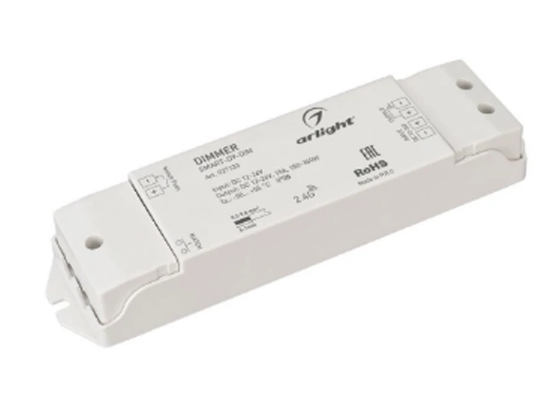Диммер для монохромной светодиодной ленты (ШИМ). Питание/рабочее напряжение 12-24 VDC, максимальный ток 15 A на канал, 1 канал, максимальная мощность 180-360 W. Винтовые клеммы. Корпус - PVC. Габариты 175 x 45 x 27 мм. Управляется пультами и панелями серии SMART (поставляются отдельно).