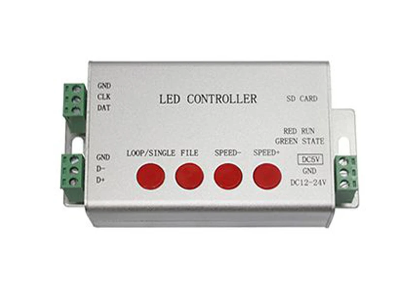Контроллер для упр-я RGB флэш-модулями для воспроизв-я текста, рисунков. Запись на SD-карту с помощью ПО LEDBuild. 1 вых. порт, максимально до 2048 pixel, без ПДУ, упр-е кнопками на корпусе. Питание 5-24 В. Размеры 150 х 82 х 38 мм.
