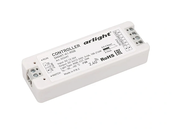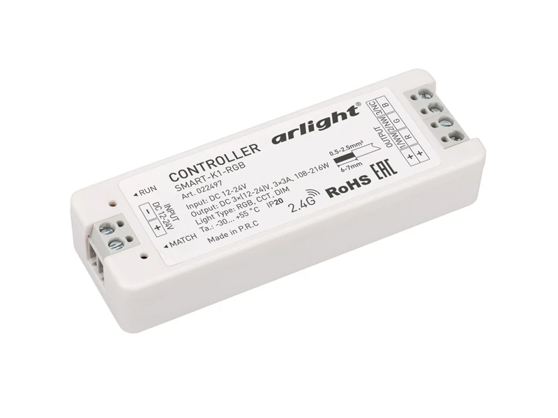 Контроллер для светодиодной RGB ленты (ШИМ). Питание/рабочее напряжение 12-24 VDC, максимальный ток 3 A на канал, 3 канала, максимальная мощность 108-216 W. Винтовые клеммы. Корпус - PVC. Габариты 97 x 33 x 18 мм. Управляется пультами и панелями серии SMART (поставляются отдельно). Гарантия 2 года с даты продажи.