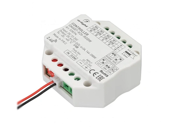 Контроллер для RGBW светодиодной ленты (ШИМ) с функцией Push-Dim. Питание/рабочее напряжение 12-24 VDC, максимальный ток 3 A на канал, 4 канала. Максимальная мощность 144-288 W. Винтовые клеммы, корпус - пластик. Габариты 52 x 52 x 26 мм, встраивается в стандартный подрозетник. Совместим с пультами и панелями SMART, поддерживающими управление по радиоканалу 2.4 G.