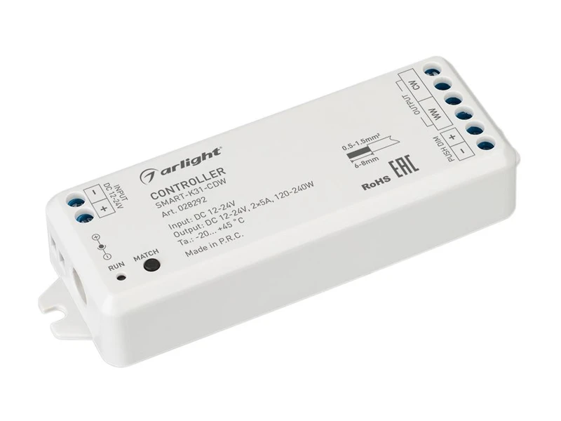 Контроллер для светодиодной биполярной CDW ленты (2 провода). Питание/рабочее напряжение 12-24 VDC, максимальный ток 5 A на канал, 2 канала, максимальная мощность 120-240 W. Винтовые клеммы. Корпус - PVC. Габариты 114 x 38 x 20 мм. Контроллер работает только с биполярными лентами, в том числе, лентами CDW. Управляется пультами и панелями серии SMART (поставляются отдельно).