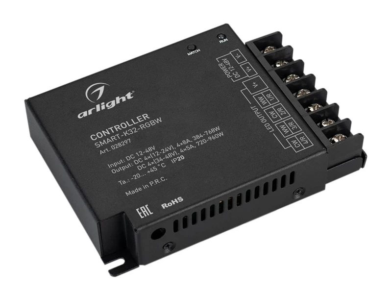 Контроллер для светодиодной RGBW ленты (ШИМ). Питание/рабочее напряжение 12-48 VDC, максимальный ток 8 A на канал для 12-24 V и 5 А на канал для 36-48 V, 4 канала, максимальная мощность 384-768 W для 12-24 V и 720-960 W для 36-48 V. Винтовые клеммы. Корпус - металл. Габариты 117 x 85 x 25 мм. Управляется пультами и панелями серии SMART (поставляются отдельно).