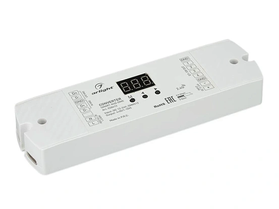 Конвертер сигнала DMX512 в 0/1-10V. Вход - DMX512, выход 0-10V и 1-10V (по выбору), напряжение питания DC 12-24V. На выходе 4 канала, ток нагрузки 20мА на канал. На корпусе цифровой монитор. Габариты 170 х 50 х 23 мм.