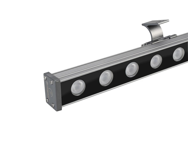 Линейный прожектор. Мощность 24 Вт, св. поток 1560 лм, 65 лм/Вт, теплый 3000 K, CRI>80, угол 15x60°, напряжение питания 230 В. Серый прямоугольный корпус из алюминия, экран стекло, степень защиты IP65. Размер: длина 1000 мм, ширина 40 мм, высота 30 мм. Монтаж на кронштейнах.