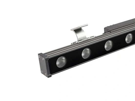 Линейный прожектор. Мощность 9 Вт, св. поток 630 лм, 70 лм/Вт, дневной белый 4000 K, теплый белый 3000 К, CRI>80, угол 15x60°, напряжение питания 230 В. Серый прямоугольный корпус из алюминия, экран стекло, степень защиты IP65. Размер: длина 500 мм, ширина 40 мм, высота 30 мм. Монтаж на кронштейнах.