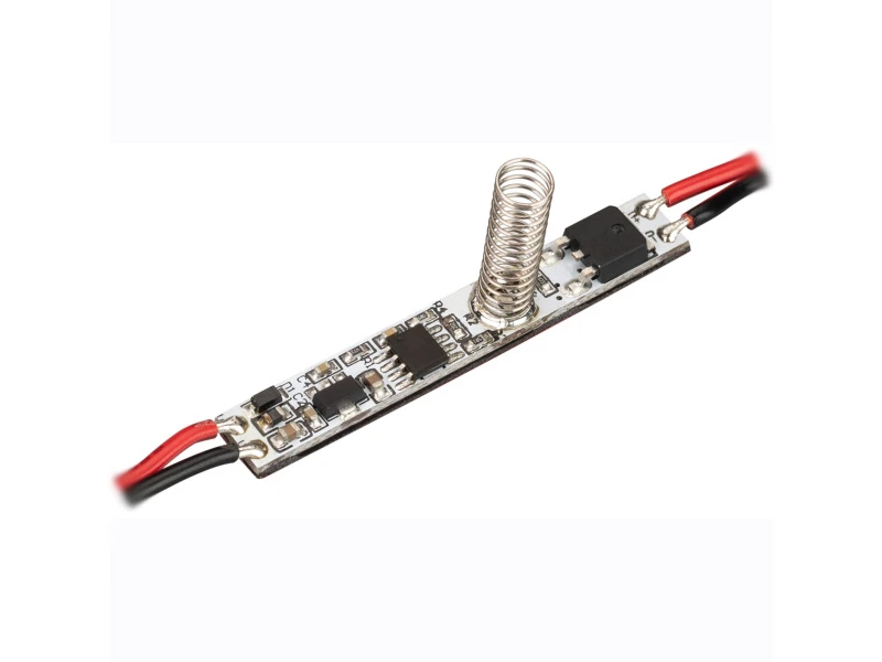 Диммер для монохромной светодиодной ленты (ШИМ), встраиваемый в алюминиевый профиль. Питание/рабочее напряжение 12-24 VDC, максимальный ток 3 A на канал, 1 канал, максимальная мощность 36-72 W. Габариты 50 x 8 x 20 мм, высота пружины 20 мм. Включение/выключение и диммирование происходят через сенсор прикосновения.