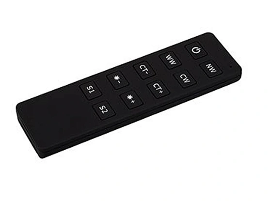 Кнопочный радиопульт 2.4 ГГц черного цвета для управления регулировки температуры свечения (MIX) источников света. 1 зона управления, управление с помощью кнопок. Питание 3 VDC (CR2032). Габариты 135 x 40 x 11 мм. Настенный держатель в комплекте. Управляет контроллерами и панелями серии SMART (поставляются отдельно).