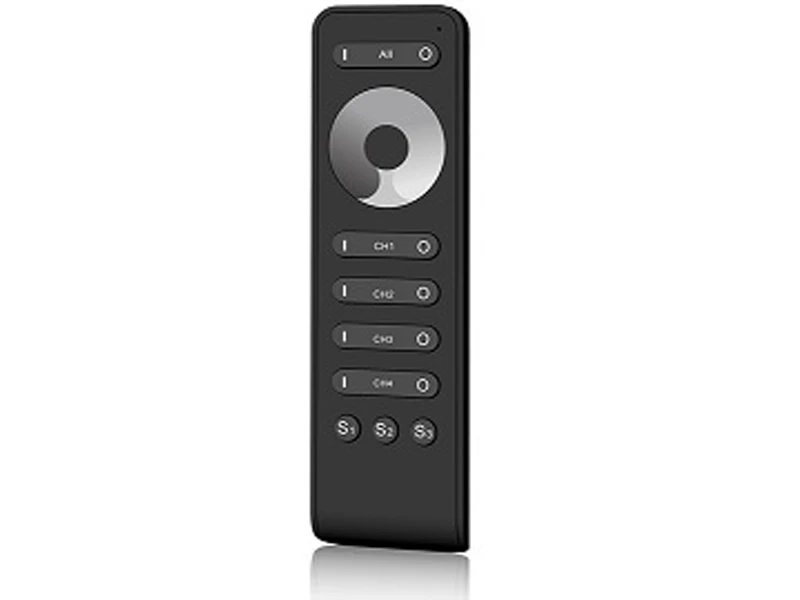Кнопочный радиопульт с сенсорным кольцом 2.4 ГГц черного цвета для управления одноцветным (DIM) источником света. 4 канала управления, 3 слота памяти пользовательских настроек, управление яркостью с помощью сенсорного кольца. Питание 3 VDC (AAA*2). Габариты 122 x 53 x 17.5 мм. Изготовлен из пластика с покрытием Soft Touch. Управляет 4-канальными контроллерами серии SMART (поставляются отдельно).
