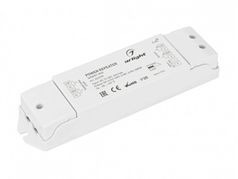 Двухканальный усилитель для диммеров (12-24 VDC). Питание 12-24 VDC. 1 канала, ток нагрузки 2x8 A, мощность нагрузки 192-576 W. Размер 175 x 45 x 27 мм.