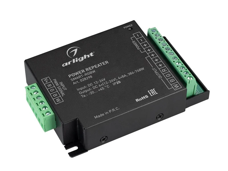RGBW-усилитель. Питание 12-24VDC. 4 канала, ток нагрузки 4x8A, мощность нагрузки 384-768W. Размер 107 x 75 x 25 мм.
