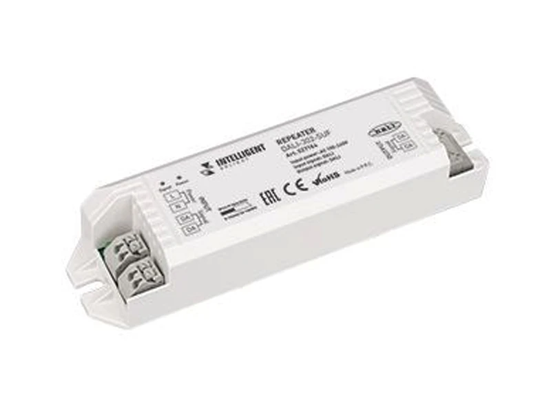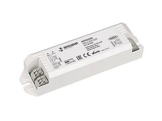Репитер (усилитель) сигнала DALI, служит для увеличения длины линии DALI дополнительно до 300 м. и 'прозрачен' для команд DALI в обе стороны. Питание 100-240 VAC. Вх. и вых. сигнал DALI. Вых. ток 250 мА. Размеры 149 x 40 x 28 мм.