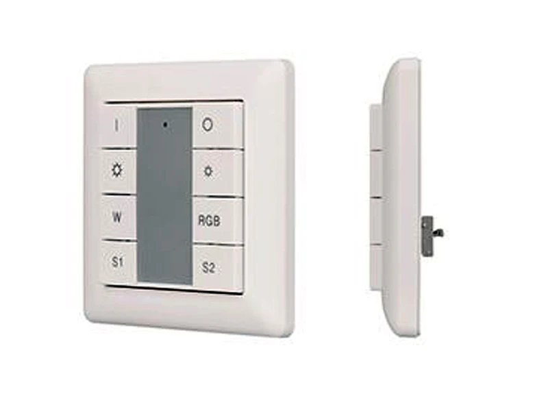 Настенная накладная пластиковая панель белого цвета с кнопочным управлением (8 кнопок управления) для мультицветных светодиодных RGBW-лент. 1 зона управления, 2 сцены с возможностью сохранения. Питание по шине DALI. Полнофункциональная работа в DALI DT8: до 64 устройств на шине, при адресации 4 каналов (RGBW) на 1 адрес.