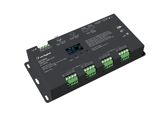 Декодер DMX512 для трансляции DMX512 сигнала ШИМ(PWM) устройствам. Питание 12-24VDC. 12 каналов, ток нагрузки 12x5A, мощность нагрузки 720-1440W. Входной сигнал DMX512, выходной сигнал ШИМ(PWM). Изменяемая частота ШИМ от 250Гц до 8000Гц. Возможность работы в режиме 'Master'. Цифровой порт XLR3, разъемы RJ45, терминальные клеммы. Цифровой дисплей на корпусе, адрес устанавливается с помощью кнопок. OLED дисплей. Размер 246x116x38.5 мм.