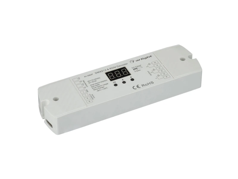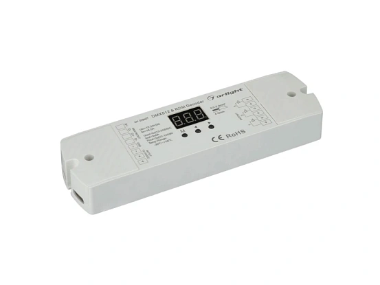 Декодер DMX512 для трансляции DMX512 сигнала ШИМ(PWM) устройствам. Питание 12-24VDC. 3 канала, ток нагрузки 3x6A, мощность нагрузки 216-432W. Входной сигнал DMX512, выходной сигнал ШИМ(PWM). Цифровой дисплей на корпусе, адрес устанавливается с помощью кнопок. Размер 170x50x23 мм.