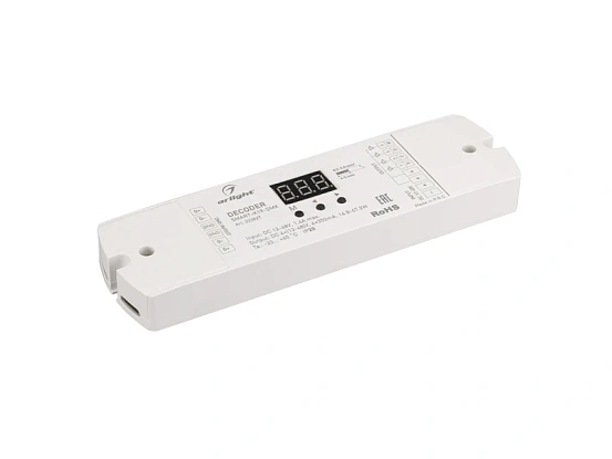 Декодер тока DMX512 для трансляции DMX512 сигнала ШИМ(PWM) устройствам, таким как светильникам и мощным светодиодам. Питание 12-48VDC. 4 канала, ток нагрузки 4x350mA, мощность нагрузки 16.8-67.2W. Входной сигнал DMX512, выходной сигнал ШИМ(PWM). Цифровой дисплей на корпусе, адрес устанавливается с помощью кнопок. Размер 170x50x23 мм. Гарантия 2 года с даты продажи.