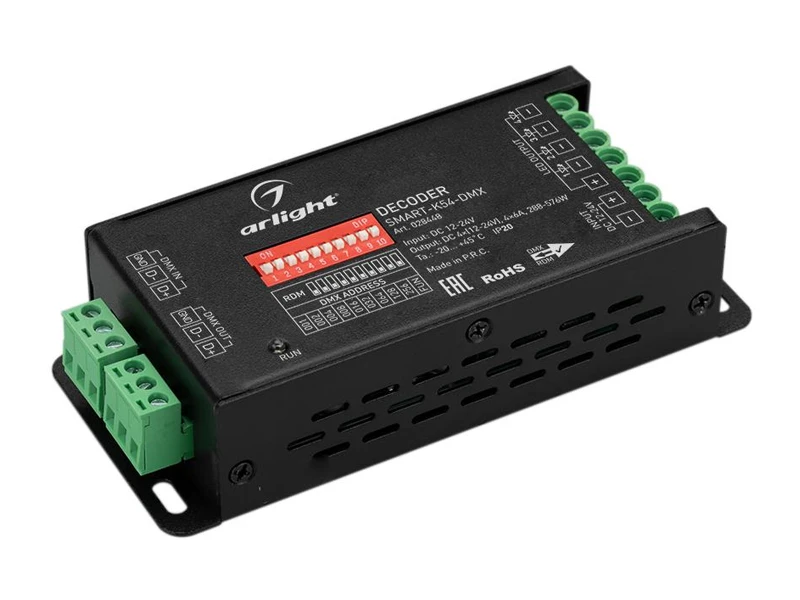 Декодер DMX512 для трансляции DMX512 сигнала ШИМ(PWM) устройствам. Питание 12-24VDC. 4 канала, ток нагрузки 4x6A, мощность нагрузки 288-576W. Входной сигнал DMX512, выходной сигнал ШИМ(PWM). Входные порты: терминальные клеммы. Адреса устанавливаются DIP-переключателями на корпусе. Размер 130х57х31 мм. DMX адреса сбрасываются при выключении питания.