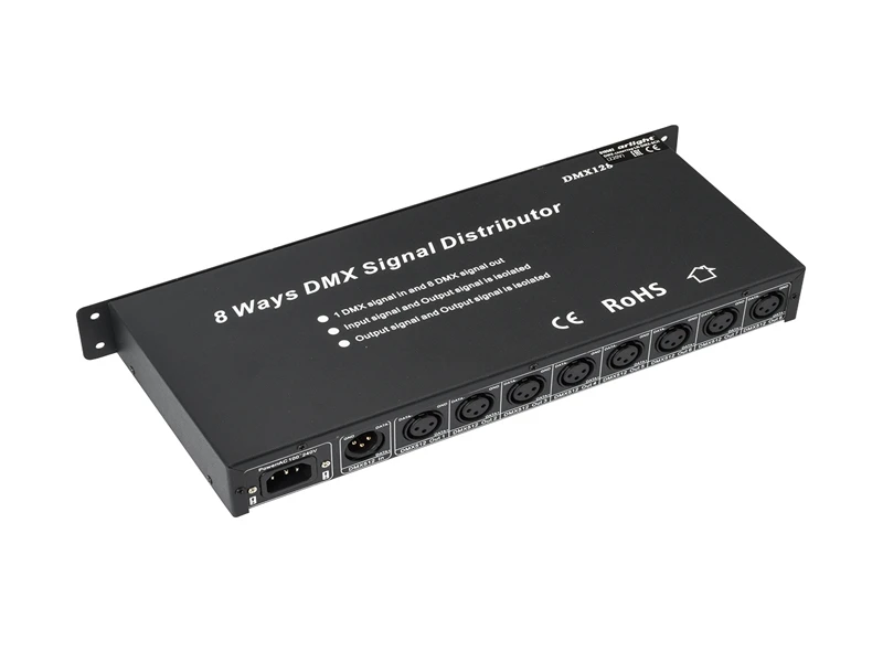 Сплиттер (контроллер-распределитель) DMX для распараллеливания входного DMX-сигнала на 8 DMX-каналов с оптической изоляцией входа от выхода и всех выходных DMX-каналов друг от друга. Количество подключаемых приемников на каждый выход max. 32. Размер 375х153х40 мм