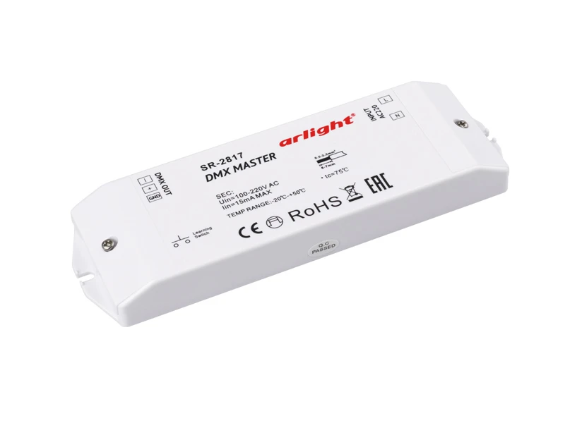 DMX контроллер, управление по радиоканалу пультами SR-2818, 2819, 2819S (поставляются отдельно), до 8 зон. Питание 220VAC, выход цифровой сигнал DMX. Подключение лент через любой DMX декодер. Размеры 177х57х21 мм.