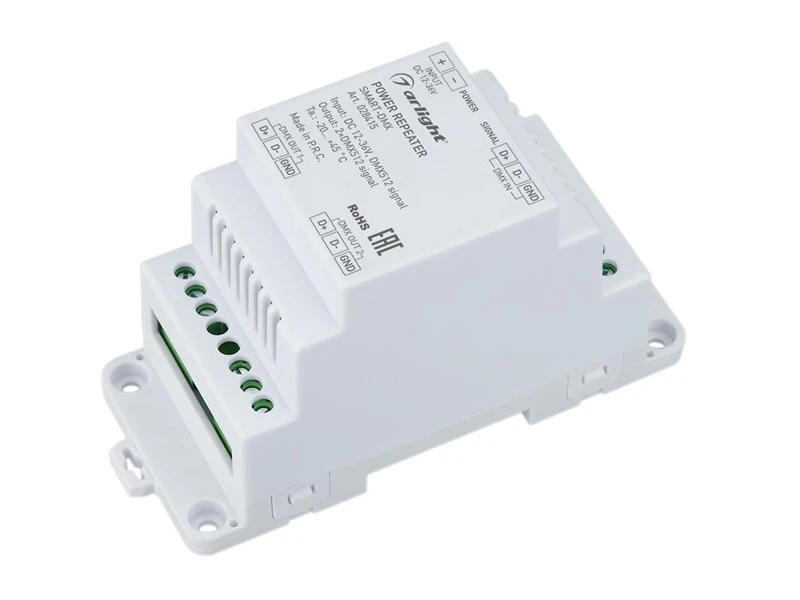 Усилитель сигнала DMX512/RDM. Вход - DMX512, выход 2CHxDMX512, напряжение питания DC 12-36V. Габариты 110х67х48 мм. Для использования на DIN-рейке.