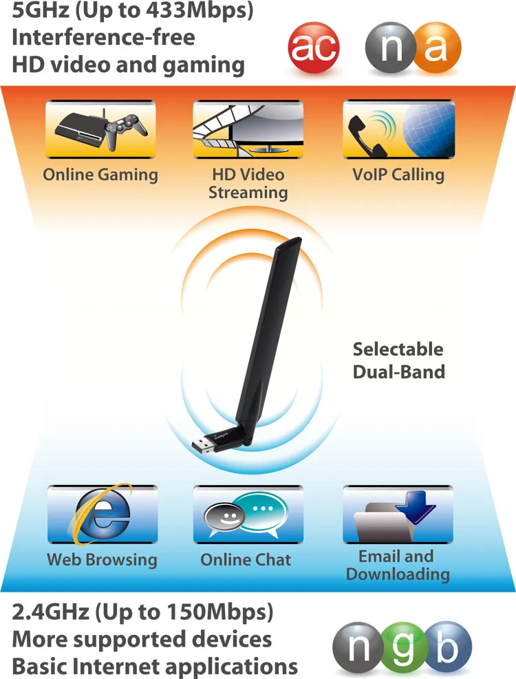 Наслаждайтесь лучшей производительностью и большей гибкостью вашего Wi-Fi устройства, используя связь в двух диапазонах частот. Адаптер EW-7811UAC обеспечивает связь на частоте 2,4 ГГц на скорости до 150 Мбит/с или на частоте 5 ГГц на скорости до 433 Мбит/с. Вы можете блуждать по Интернету и просматривать почту в диапазоне 2,4 ГГц или выбрать диапазон 5 ГГц для онлайн игр или просмотра видео.