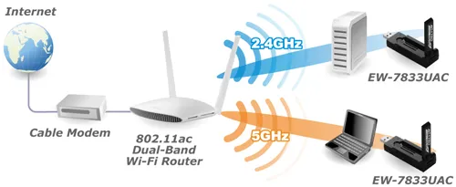 Наслаждайтесь производительностью и гибкостью с двухдиапазонным подключением. EW-7833UAC обеспечивает соединение 2.4 ГГц до 450 Мбит/с и 5ГГц до 1300 Мбит/с. Занимайтесь веб серфингом или проверьте электронную почту на диапазоне 2,4 ГГц или используйте высокоскоростную полосу 5 ГГц для онлайн-игр и потоковой передачи YouTube или Netflix HD.