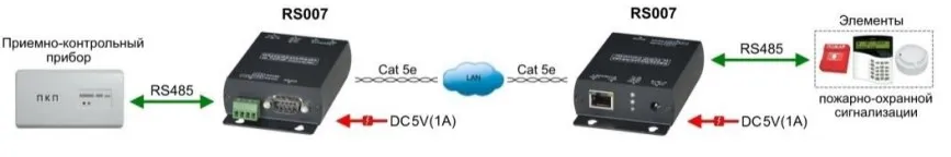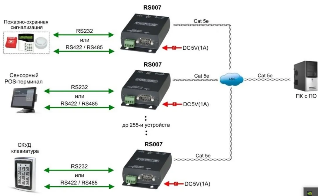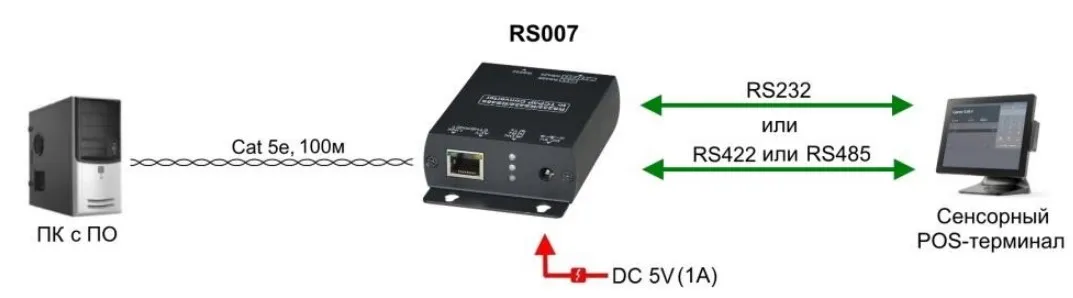 Преобразователь интерфейса RS007 обеспечивает подключение устройств с интерфейсами RS232, RS422, RS485 к сети Ethernet и передачу по ней сигналов управления на расстояние до 100м.