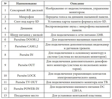 К монитору можно подключить одну или две вызывные панели, одну или две дополнительные внешние камеры, один или два датчики тревоги, дополнительный монитор с композитным входом, управляющие контакты электромеханического замка, а также до 5 дополнительных домофонных мониторов марки CTV.