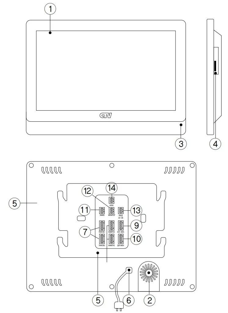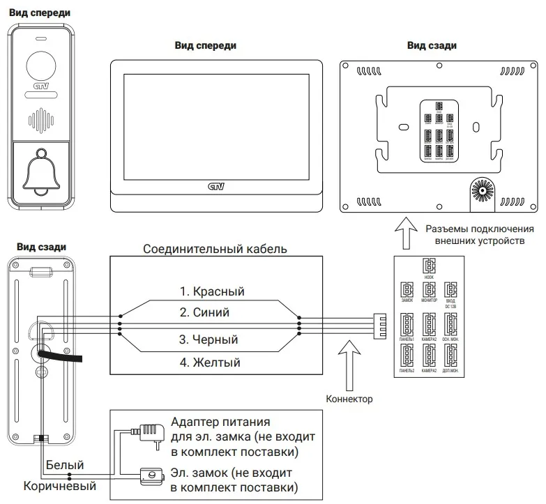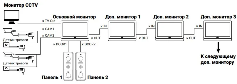 К монитору можно подключить 1 или 2 вызывные панели, 1 или 2 внешние камеры, 1 или 2 датчика тревоги, дополнительный монитор с композитным входом, а также до 5 дополнительных домофонных мониторов марки CTV.