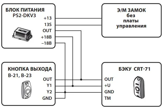 Схема подключения CRT-71 к блоку питания PS2-CDKV3, замку без платы управления и кнопке выхода B-21 (В-23).