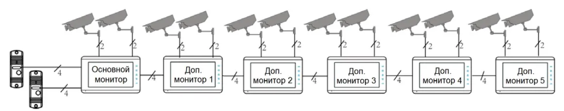 - Подключение дополнительных мониторов: Поддержка до 5 дополнительных мониторов по интеркому