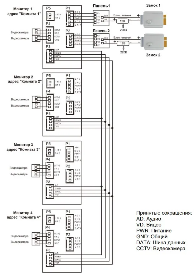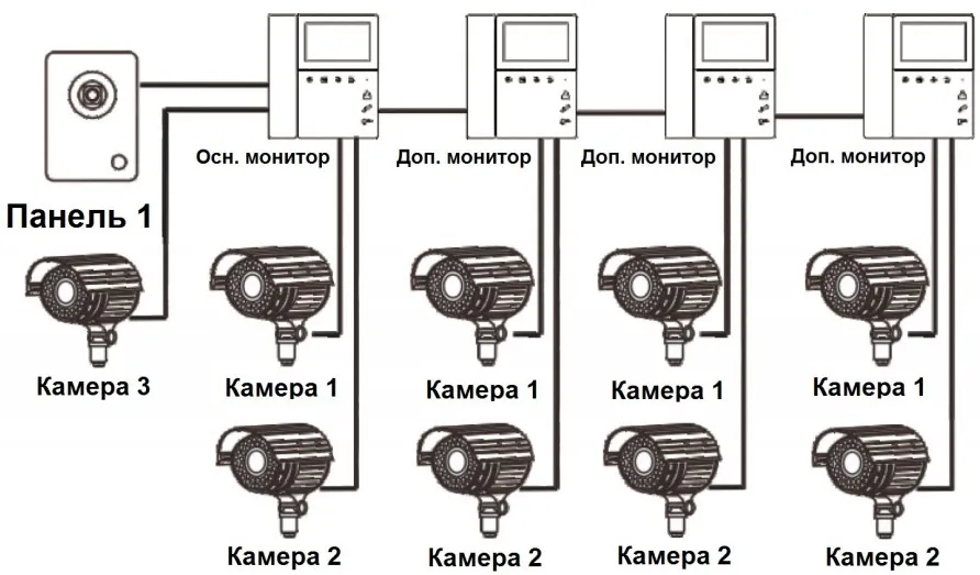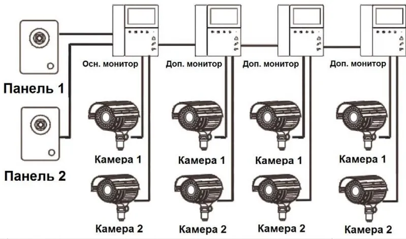 Подключение двух вызывных панелей и видеокамер