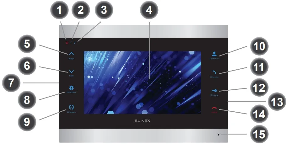 - Индикатор питания домофона. Светится при подключенном питании,