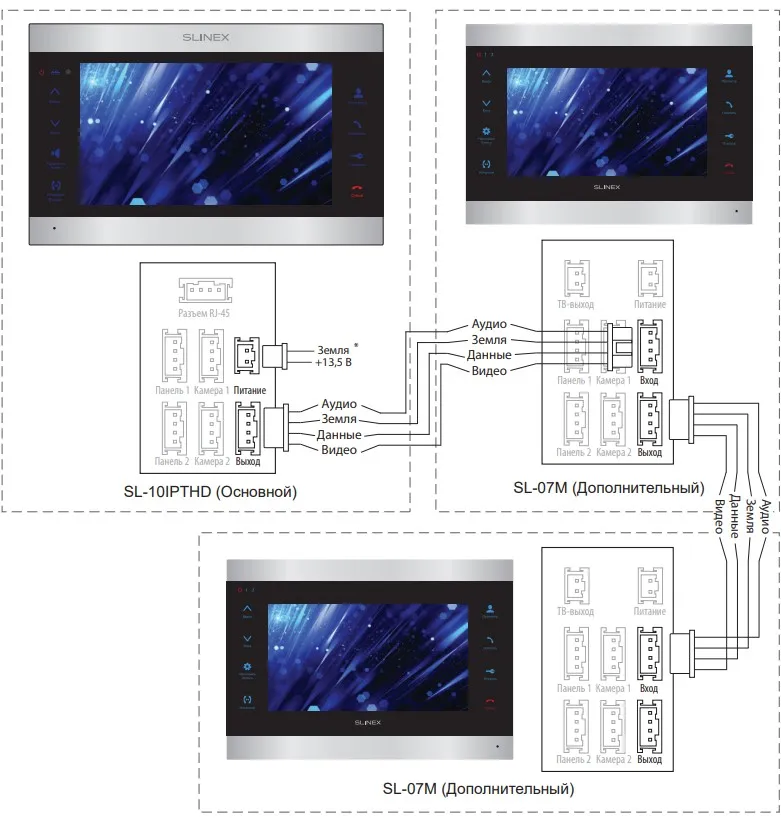 - Интерком: До 4-х (3-х) мониторов в системе. Модель SL-10IPT(HD) или SL-07IP(HD) может быть использована только как основной домофон в системе