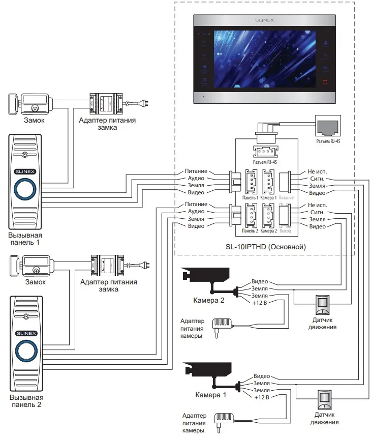 Подключение вызывных панелей и камер к домофону SL-10IPTHD.