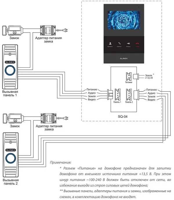 Подключение двух вызывных панелей к домофону SQ-04.