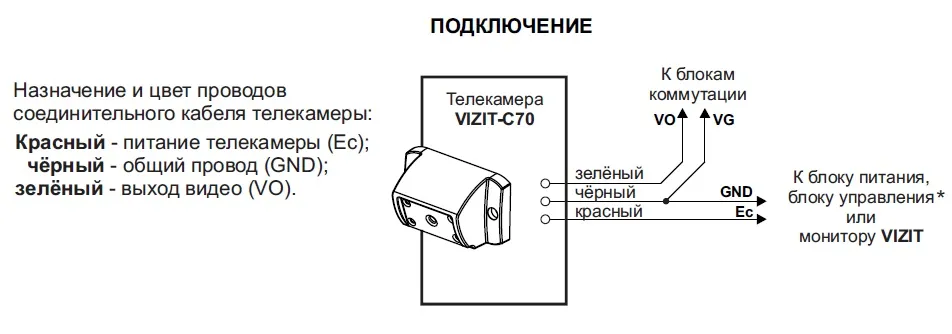 VIZIT C70 - телекамера цветного изображения CCD 1/3 с функцией 'День-ночь' в антивандальном корпусе (700 tvl, PAL, 0 Lux / ИК подсветка для телекамеры, объектив f=3,7 мм, угол обзора по диагонали 90°). Напряжение питания 12-30VDC. Диапазон рабочих температур от -30 до +45 °С. Предназначена для использования в составе видеодомофонов VIZIT в качестве устройства видеонаблюдения.