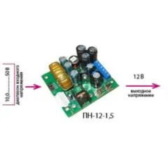 Бастион ПН-24АС/12-1,0 (встраиваемый модуль на печатной плате размером 64х52 мм) преобразует входное напряжение от 19 до 27 В переменного тока в выходное стабилизированное напряжение 12 В постоянного тока для питания нагрузки с током потребления до 1 А.