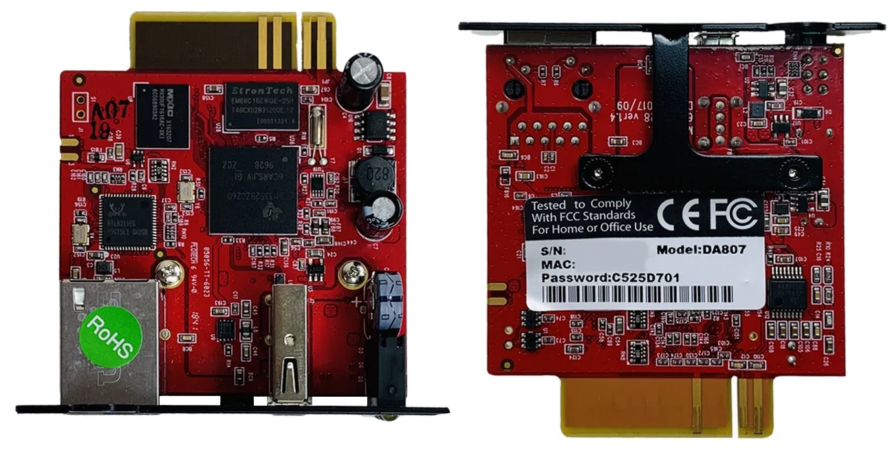 Аналог карты DY802, но с возможностью мониторинга температуры, влажности и затопляемости окружающей среды при подключенном соответствующем датчике USB Netfeeler. Карта SNMP предназначена для удаленного мониторинга и управления ИБП через локальную сеть или Интернет. Позволяет в режиме реального времени получать информацию о состоянии электросети и ИБП. Благодаря наличию встроенного http-сервера доступ к карте может осуществляться через любой веб-браузер.