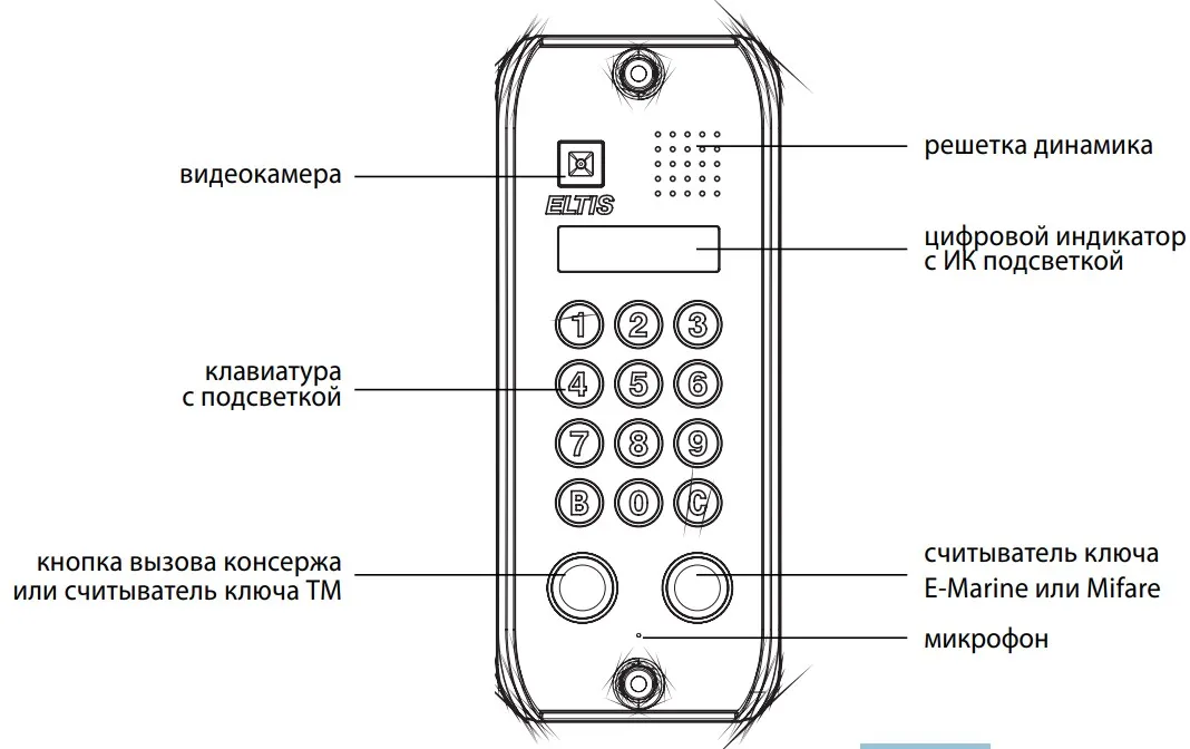 Вандалозащищенность: Металлический корпус и кнопки, видеокамера с точечным объективом, защита динамика и микрофона.