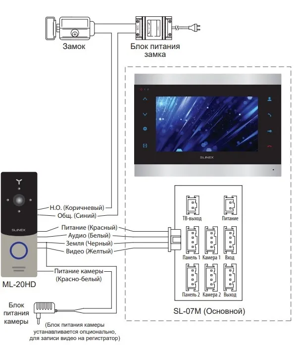 Подключение панели к регистратору или видеодомофону с функцией регистратора, гарантирует просмотр беспрерывной видеозаписи происходящего или сохранения записей по обнаружению движения без условия совершения вызова.