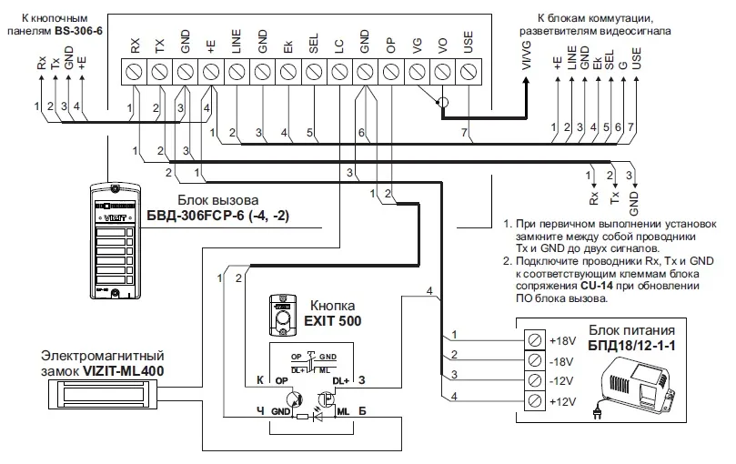 - ключами VIZIT-RF3.x, VIZIT-RF4.x (13.56 МГц). Возможность записи ключей «квартирным» (до 40 ключей для каждой квартиры) и «сплошным» списком (до 960 ключей). Возможность автоматической записи ключей - режим «Акцепт» (доступен только при установке «сплошного» списка записи ключей). Удаление ключей. Общее включение/выключение сигнализации (короткий звуковой сигнал) в абонентских устройствах квартир при использовании ключей (для всех квартир). Включение/выключение сигнализации (короткий звуковой сигнал) в абонентском устройстве соответствующей квартиры при использовании ключей (для каждой квартиры). Обновление базы ключей и изменение установок с помощью бесконтактного модуля памяти VIZIT-RFM4. Программируемая продолжительность отпирания замка (от 1 до 20 секунд). Возможность подключения до трёх кнопочных панелей для увеличения количества подключённых абонентов. Параллельная работа до 2-х блоков вызова. Работа с пультом консьержа. Связь “Консьерж - Посетитель” по инициативе консьержа. Сигнал вызова в абонентском устройстве и дублирование сигнала в блоке вызова на время нажатия кнопки. Регулировка громкости служебных сигналов. Регулировка громкости дуплексной связи. Звуковая и световая сигнализация режимов работы. Подсветка кнопок вызова и именных табличек. Автоматическая компенсация сопротивления линии, повышающая устойчивость разговорного тракта. Возможность обновления ПО на объекте (с использованием блока сопряжения CU-14).